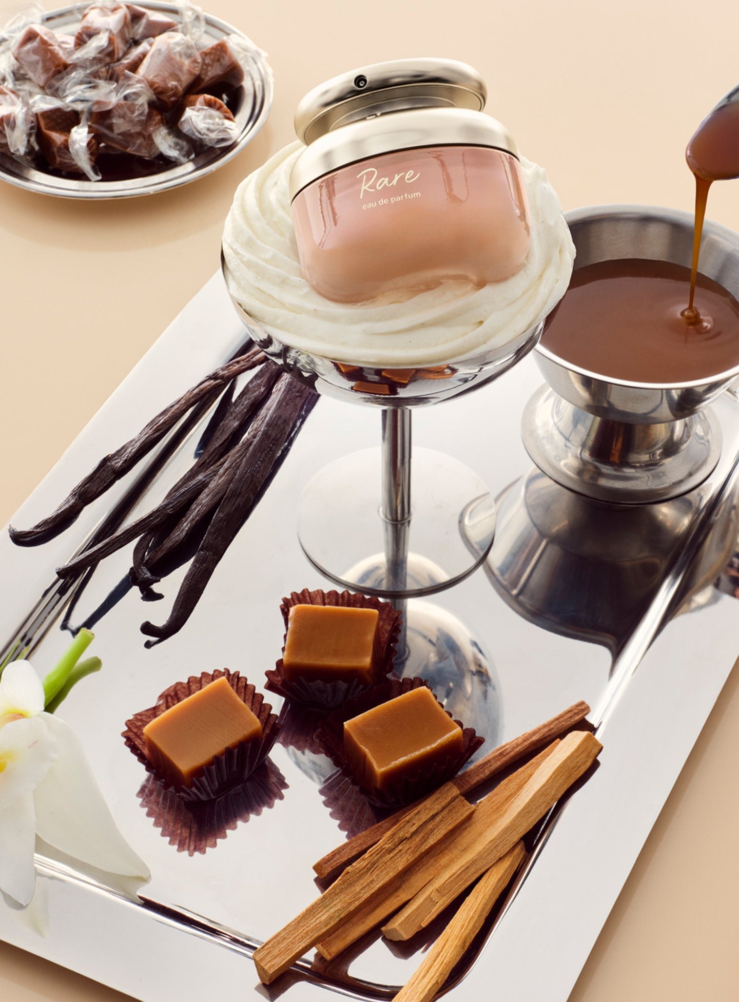 Warm and decadent with a touch of spice, Rare Eau de Parfum welcomes you with notes of creamy caramel and pistachio, gives way to an unexpected duality of rich vanilla and spicy ginger, then dries down to an earthy sandalwood. Bright yet deep, familiar yet unexpected, this is a fragrance that evolves with every passing moment, lingering for up to 12 hours. THE SCENT